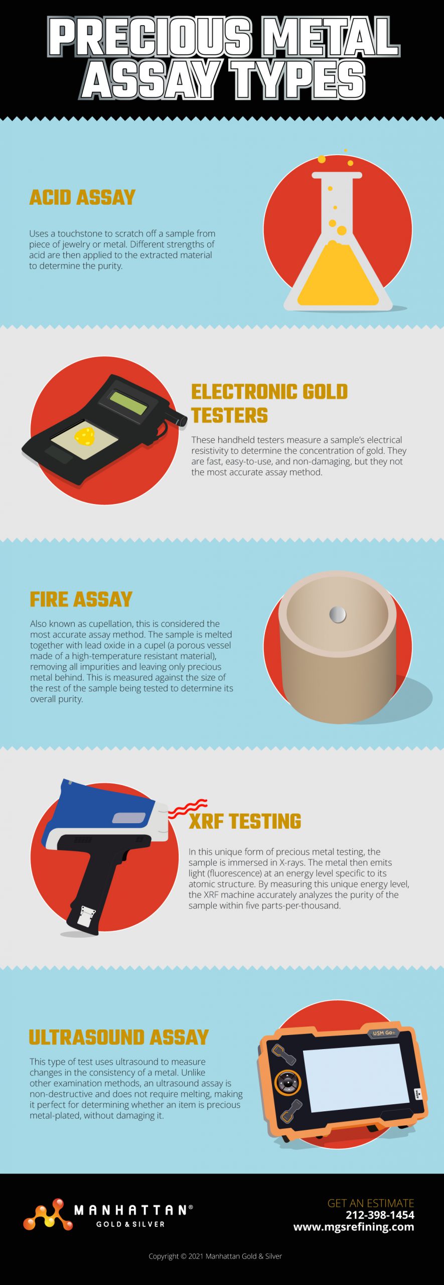Manhattan Gold & Silver commonly uses hand testing, XRF, ultrasound, and fire assays to test precious metals. These precise assays are what allow us to make such quick and accurate payouts for our customers.